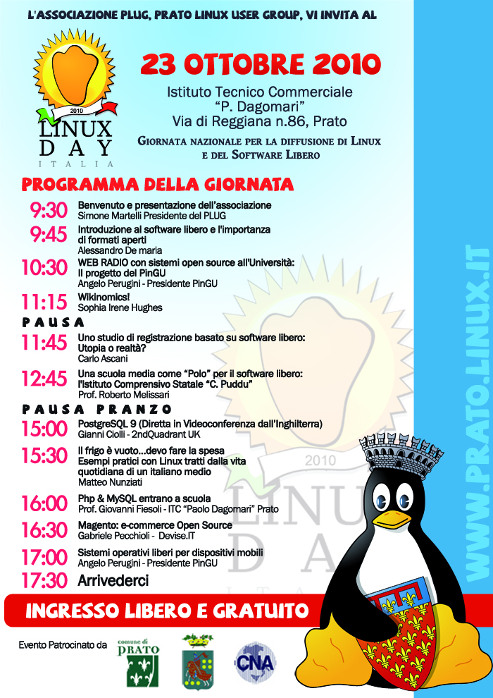 Sabato 23 ottobre all'Istituto Tecnico Dagomari, si terrà il Linux Day 2010 di Prato. Questo evento che si rinnova oramai da 10 anni è organizzato e promosso dall'associazione culturale PLUG - Prato Linux User Group, che da oltre 10 anni promuove la cultura del software libero e della libertà digitale di ciascuno.